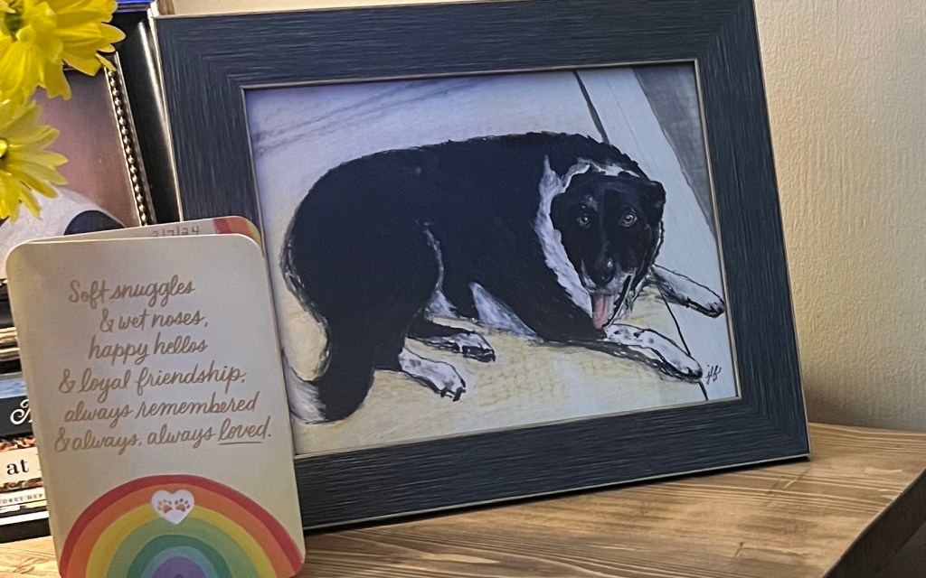 We were not prepared to say goodbye. Watching my husband and father-in-law dig her grave on the farm that Friday evening was hard. Her grave sits just in the tree line near the big house on the farm and the rocks that had been thrown aside from tilling up the garden over the last few years made a wonderful marker to find her on our farm walks. It has taken many weeks to process her loss and her siblings are just now finding a rhythm where they are no longer moping around all day. There are reminders of her all through our house; most prominently in the beautiful artwork that my parents had commissioned by local artist Joanna Finley.
